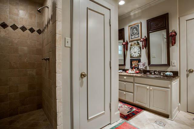 I’m really glad you featured this house. It is definitely over the top but loaded with personality. It’s evident that the owner has a passion for beautiful things and has placed them with great care. What struck me most about this house is the fearless use of color. Notice the room with the tangerine walls, brown chesterfield sofa, vibrant turquoise oriental carpet which pulls the color of the chandelier in the adjacent eating area and the artwork. Wowser! Not for the faint of heart. Also, the landscape is adorable but the colorful flowers and orange umbrella really make it pop.