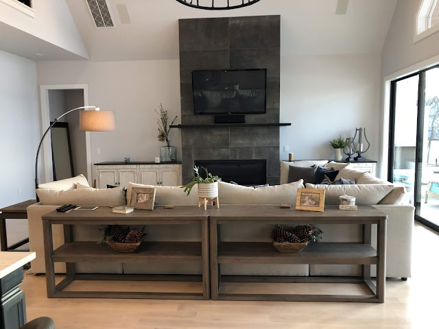 This is a mock up I did placing furniture in the room. The house was still in construction at this point. The giant fireplace was the biggest challenge of the room. The tall cathedral ceiling with beams made sense with the fireplace but it was giant and dwarfed everything else. The other side of the room has a large open white kitchen with marble counters. I suggested the two matching consoles that would provide much needed storage and would make the scale of the fireplace make sense. I suggested artwork but Jen chose to spend time looking for things that are special to her. Which I will not argue with. Art should be personal. But even now 8 months later, her walls are still bare. She'll eventually fill them.